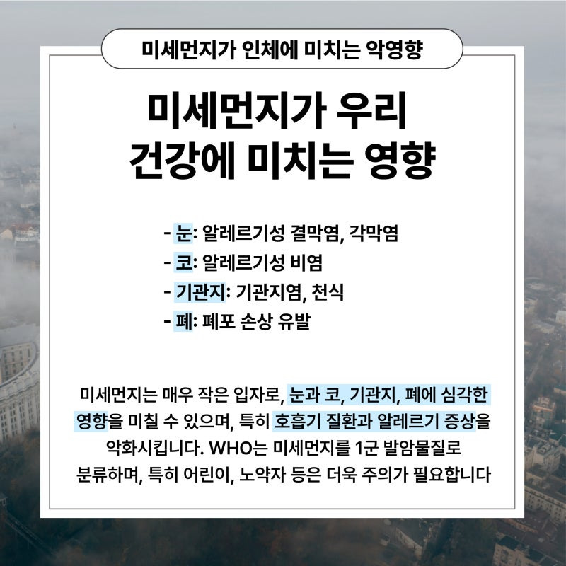 미세먼지는 단순한 알레르기 반응을 넘어서, 심각한 건강 문제를 일으킬 수 있습니다. 호흡기 질환, 심혈관 질환, 피부 질환 등 다양한 건강 문제를 유발할 수 있습니다. 특히, 미세먼지가 많은 봄철에는 더욱 주의가 필요합니다. 미세먼지가 호흡기를 통해 체내로 들어가면, 기관지염, 천식 등의 질환을 유발할 수 있습니다.