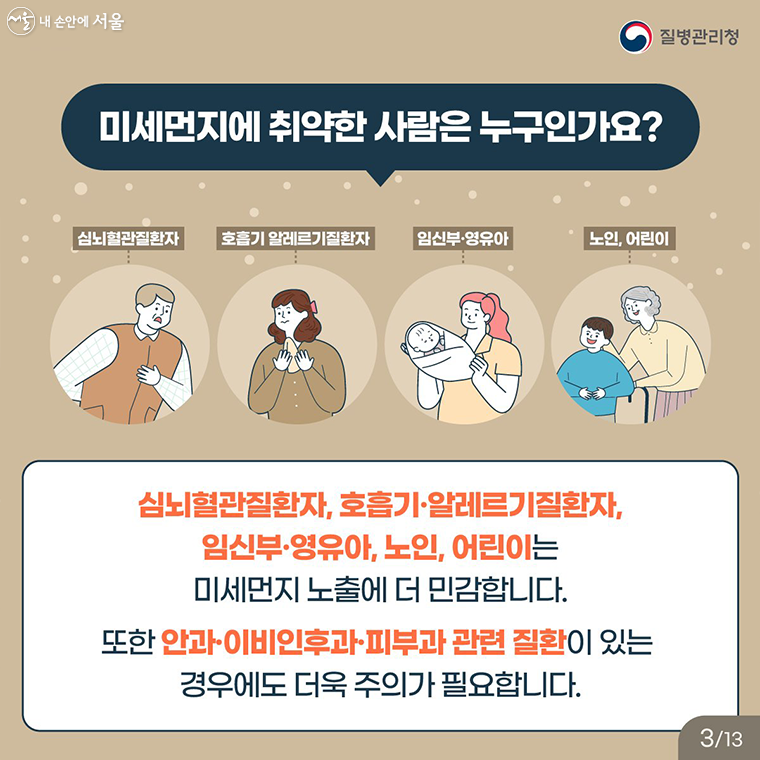 미세먼지에 특히 민감한 사람들은 다음과 같습니다: